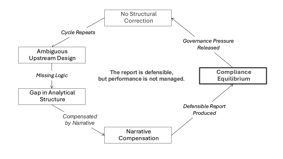 Any ambiguity embedded upstream – in intent, measures, analysis expectations, or management design – is reproduced through repetition. When clarity is weak in the design cycle, the reporting cycle compensates through commentary, interpretation, and visual emphasis.