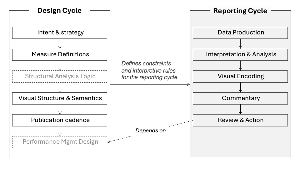 Performance reporting operates as a chain of interdependent activities. Some are established infrequently as part of the design cycle; others repeat continuously as part of the reporting cycle. Clarity – or the lack of it – is embedded across this chain and replayed over time.